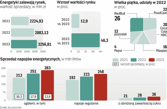 Produkcja napojów energetycznych to dziś złoty interes. Analitycy Euromonitora w analizie dla „Rz” obliczyli, że wartość rynku jeszcze przed dwoma laty wynosiła 2,22 mld zł, by w 2023 r. osiągnąć poziom niemal 3,26 mld zł, co daje wzrost o ponad 46 proc. od 2021 do 2023 r. Inflacja nie miała tu wielkiego wpływu, bo w tym samym czasie ilość sprzedanego napoju wzrosła o jedną trzecią, do 283 mln litrów. Jeszcze wyższe są szacunki Nielsena, który jednak podaje dane wspólnie dla napojów energetyzujących i izotonicznych – wartość tak liczonego rynku to już 3,8 mld zł.