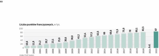 Rynek rozwijał się mocno w ostatnich latach, najwyższy przypływ franczyzobiorców podczas pandemii zanotowały sieci spożywcze czy gastronomiczne, nawet z tempem rozwoju sieci rzędu 10–20 proc. Na polskim rynku franczyzowym dominują rodzime firmy, 80 proc. franczyz to krajowe marki. Przy średnim zatrudnieniu sześciu osób na placówkę franczyzową łączna liczba zatrudnionych w tym sektorze to około 500 tys. osób.