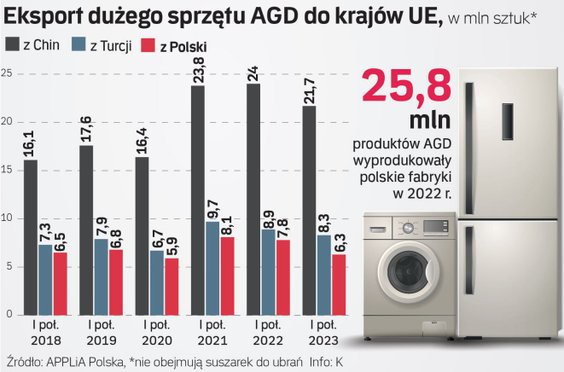 Eksport chińskiego sprzętu AGD na rynki unijne rośnie od lat i jest już dużo wyższy niż nasza produkcja. Z danych organizacji producentów APPLiA Polska wynika, że w I półroczu 2023 r. na rynki unijne trafiło z tego kraju 21,7 mln sztuk sprzętu. W tym samym czasie z polskich zakładów było to 6,3 mln, zatem można mówić już o przepaści. Dodatkowo, więcej niż nasze zakłady na unijne rynki sprzedały również firmy tureckie – było to 8,3 mln sztuk.