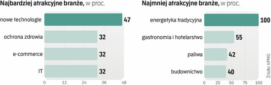 Natomiast obie grupy inwestorów za najmniej atrakcyjny sektor zgodnie uznały energetykę konwencjonalną. Słabe oceny zebrały też branże gastronomiczna z hotelarstwem, paliwowa i budownictwo. Co ciekawe, jako nieatrakcyjne uznano też sektor rozrywkowy i handel zarówno detaliczny, jak i hurtowy.