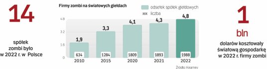 Raport podsumowuje wyniki globalnej analizy 70 tysięcy spółek giełdowych ze 153 krajów (w tym z Polski) działających od co najmniej dziesięciu lat. Jak z niej wynika, w ubiegłym roku już prawie 5 na 100 (4,8 proc.) z ponad 41 tys. giełdowych firm prowadzących w ubiegłym roku aktywną działalność gospodarczą stanowiły spółki zombi, które nie były w stanie wypracować zysków operacyjnych wystarczających na pokrycie bieżących zobowiązań odsetkowych.
