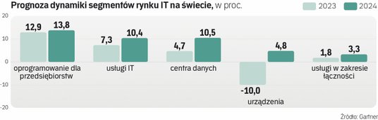 Również w 2024 r. oprogramowanie będzie liderem zwyżek, a dynamika ma być jeszcze wyższa, wynosząca 13,8 proc. Pozostałe cztery segmenty też powinny urosnąć: usługi IT – o 10,4 proc., centra danych – o 9,5 proc., urządzenia – o 4,8 proc., a usługi telekomunikacyjne – o 3,3 proc. Jeszcze do 2022 r. to właśnie ten ostatni segment najwięcej ważył w całym rynku wydatków na IT. Według prognozowanych danych na 2024 r. na lidera wyrosły usługi IT z wartością prawie 1,55 bln dol., co stanowi prawie 31 proc. całego rynku. Warto zwrócić też uwagę na segment oprogramowania, który w przyszłym roku po raz pierwszy w historii będzie miał wartość ponad 1 bln dol.