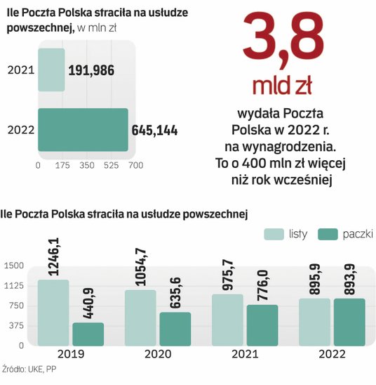 Z naszych nieoficjalnych informacji wynika, że od początku roku państwowy operator wygenerował ponad 0,5 mld zł strat. Do tego spółka musi liczyć się od stycznia z kolejnymi potężnymi wydatkami. Rośnie bowiem pensja minimalna. Jak wskazuje nam Piotr Moniuszko, przewodniczący Wolnego Związku Zawodowego Pracowników Poczty, w skali roku chodzić może o kwotę rzędu blisko 700 mln zł.