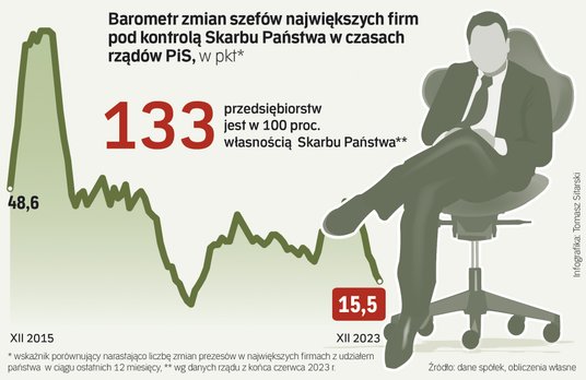 Potentat infrastruktury kolejowej jest jednym z 42 największych przedsiębiorstw pozostających pod bezpośrednią lub pośrednią kontrolą Skarbu Państwa, które uwzględniamy w barometrze „Rzeczpospolitej”. W mijającym roku w ośmiu z nich doszło do zmiany prezesa, o ponad połowę rzadziej niż w niespokojnym dla „państwowych” szefów 2022 r. W rezultacie wskaźnik naszego barometru, który pokazuje w 12-miesięcznej skali rotację prezesów firm kontrolowanych przez państwo, spadł w grudniu do 15,5 proc.