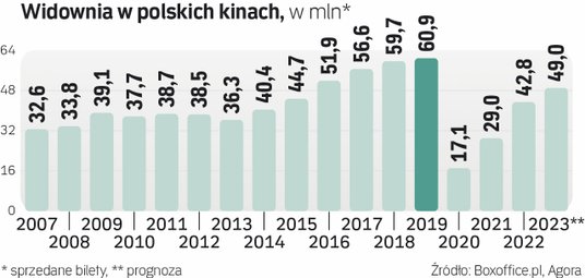 Tomasz Jagiełło ocenia zaś, że tym roku na polskie produkcje sprzeda się ok. 9 mln wejściówek (ok. 18 proc. wszystkich). Szacunki szefa Heliosa oznaczałyby, że tegoroczna frekwencja będzie o niecałe 15 proc. wyższa od ubiegłorocznej.