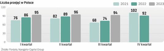 Statystyk za cały 2023 r. jeszcze nie ma, ale jest duże prawdopodobieństwo że liczba transakcji zawartych w Polsce będzie wyższa niż w 2022 r. Z danych Fodaty wynika, że narastająco w trakcie dziewięciu miesięcy 2023 r. wzrost wyniósł 14,4 proc., a czwarty kwartał obfitował w doniesienia o fuzjach i przejęciach. Jednak za wcześnie, żeby z tego obrazu wyciągać mocno optymistyczne wnioski.