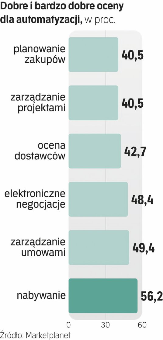 Wynika z niego, że ogółem ponad 34 proc. menedżerów ocenia automatyzację procesów w swojej firmie dobrze, a bardzo dobrze ponad 16 proc. Wysoko oceniany jest również obszar procurementu (ponad 55 proc. pozytywnych opinii). Jednocześnie z raportu wynika, że wciąż ponad 20 proc. firm nadal nie korzysta z żadnych narzędzi automatyzujących zakupy, co pokazuje, jak ogromny potencjał tkwi wciąż w tego rodzaju usługach.