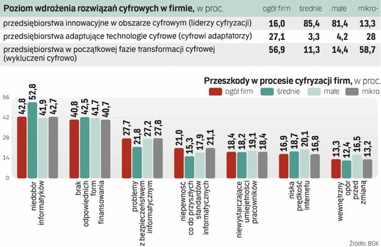 Okazuje się, że przedsiębiorstwa innowacyjne w obszarze cyfryzacji, tzw. liderzy cyfryzacji, to 16 proc. mikro-, małych i średnich firm w naszym kraju. Nieco ponad 27 proc. MŚP to firmy adaptujące technologie cyfrowe. Największą grupę, bo aż 57 proc., tworzą przedsiębiorstwa znajdujące się w początkowej fazie transformacji cyfrowej. Średnio, jak dotąd, udało im się wdrożyć zaledwie jedną z dziewięciu analizowanych technologii. Aż co piąta firma z sektora nadal nie korzysta jednak z żadnych narzędzi cyfrowych. Są to niemal wyłącznie mikroprzedsiębiorstwa.