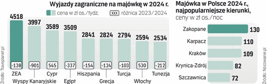 W rezerwacjach zagranicznych najbardziej popularne są tradycyjnie Turcja i Grecja. W krajowych – miejscowości górskie, chociaż powoli zaczyna się to zmieniać. Na razie rezerwacji na majówkę w kraju jest mniej więcej tyle, co rok temu. Zagranicznych – zgłoszonych do końca pierwszego tygodnia marca – dwa razy więcej niż przed rokiem. Nowością jest to, że krajowe pobyty się wydłużyły.