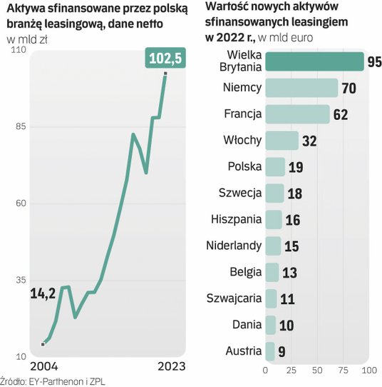 W latach 2012–2022 polski rynek leasingu rozwijał się średniorocznie ponaddwukrotnie szybciej niż cały rynek europejski i 2,5-krotnie szybciej niż np. rynek niemiecki (Polska – 10,9 proc. rocznie, Europa – 4,74 proc. rocznie, Niemcy – 3,95 proc. rocznie.). Z badania przeprowadzonego pod koniec 2023 r. przez KE wynika, że w Polsce spośród wszystkich krajów UE najwięcej firm poszukujących finansowania inwestycji (38 proc.) sięgnęło w ciągu ostatnich sześciu miesięcy po leasing. Za nami znalazły się Finlandia (37 proc.), Niemcy (28 proc.), Austria (26 proc.) i Szwecja (25 proc.). ∑