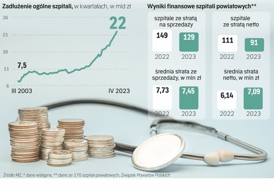 Ministerstwo Zdrowia szacuje, że w zeszłym roku zadłużenie szpitali wzrosło o ok. 2,5 mld zł, do 22 mld zł. Są to informacje wstępne, ostateczne zostaną podane na przełomie maja i czerwca. Jeśli w podobnym tempie jak długi ogółem wzrosły te wymagalne (czyli te, których termin spłaty minął), to mogą one wynieść ok. 2,5–2,6 mld zł.