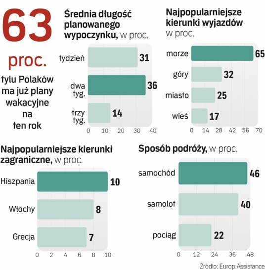 Tegoroczny urlop wakacyjny Polaka będzie trwał przeciętnie dwa tygodnie, tak jak przed rokiem, przy czym 43 proc. badanych zadeklarowało, że spędzi wakacje podróżując po kraju. W dalszym ciągu najczęściej wskazywanym kierunkiem wyjazdów jest morze (65 proc., wzrost o 4 pkt proc.) i góry (32 proc., spadek o 2 pkt proc.). 39 proc. badanych wyjedzie za granicę. W tym roku popularne kierunki to Hiszpania (10 proc.), Włochy (8 proc.) i Grecja (7 proc.). O ich wyborze decyduje klimat i gwarancja dobrej pogody (42 proc., wzrost aż o 16 pkt proc.). Istotną dla nas sprawą jest też to, że już tam byliśmy i czujemy się bezpiecznie (30 proc.).