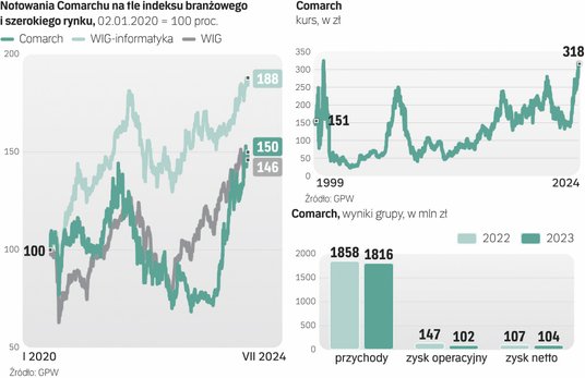 O kilkanaście procent przy wysokich obrotach drożały w środę akcje Comarchu. Po południu wyceniano je na 320 zł (+12 proc.). To o 2 proc. więcej, niż ew wezwaniu rodzina Filipiaków wraz z funduszem CVC Capital Partners oraz Anną Prokop. Ich oferta to 315,4 zł za akcję.