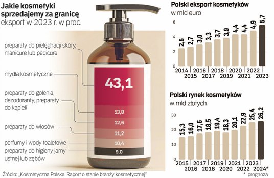 Jesteśmy piątym w Europie i dziewiątym na świecie eksporterem kosmetyków (z 3,8-proc. udziałem w globalnej sprzedaży). Przyczynił się do tego ubiegłoroczny, 17-proc. wzrost przychodów polskich firm z zagranicy, które – według cytowanych w raporcie danych Eurostatu – sięgnęły niemal 5,7 miliarda euro.