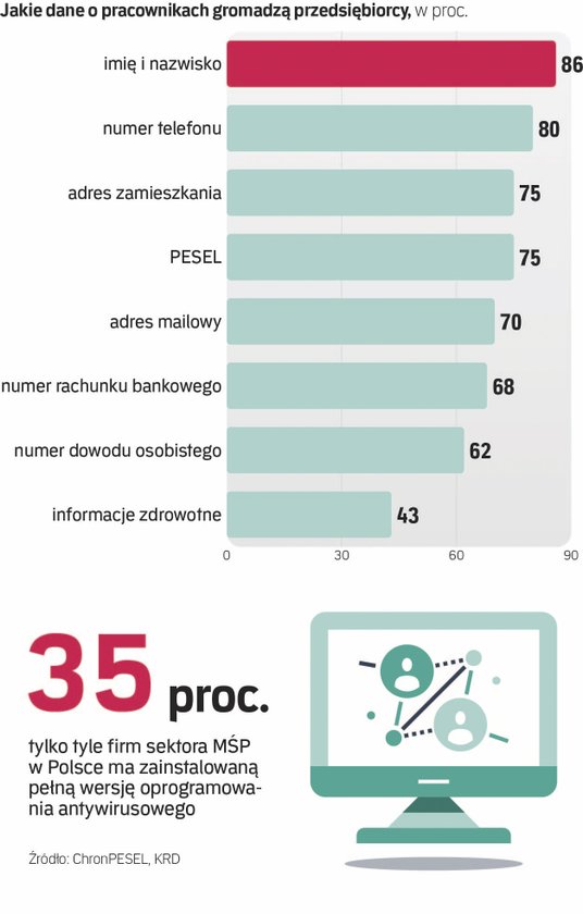 Wynika z niego, że aż 35 proc. firm MŚP boi się, że dane osobowe ich pracowników zostaną wykradzione. Raport, który powstał pod auspicjami Urzędu Ochrony Danych Osobowych, nie pozostawia złudzeń – ta „atrakcyjność” danych osobowych zgromadzonych w mikro-, małych i średnich firmach dla hakerów wynika też z tego, że zdecydowana większość z nich, bo aż 83 proc., przechowuje je w wersji cyfrowej.