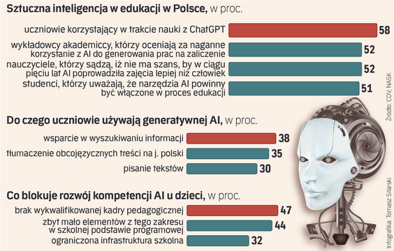 Sztuczna inteligencja ma potencjał, by odmienić polską szkołę – jak tłumaczą specjaliści, AI może pomóc nauczycielom w uatrakcyjnieniu lekcji, m.in. poprzez tworzenie gier na podstawie lektur czy generując cyfrowych asystentów, dostosowujących np. konkretną treść edukacyjną do uczniów z dysleksją. Ale w kontekście wykorzystania takiej technologii pojawiają się również pytania natury prawnej, bo czy AI jest w stanie bazować na podręczniku (chodzi o kwestie prawa do własności intelektualnej), a także czy bot może komunikować się z niepełnoletnim uczniem?