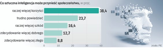 Najnowszy raport PIE, który „Rzeczpospolita” publikuje jako pierwsza, wskazuje, że respondenci najczęściej wskazują pozytywny wpływ AI na codzienne sprawy, kwestie związane ze zdrowiem oraz edukacją. Najmniej pozytywnych wskazań dotyczyło rynku pracy (to jedyny obszar, w którym odpowiedzi negatywne przeważały nad pozytywnymi). Co ciekawe, mocno liczymy na to, że zaawansowane algorytmy usprawnią funkcjonowanie administracji publicznej. Ponad 60 proc. badanych zgodziło się z twierdzeniem, że cyfrowe usługi urzędów powinny być wzbogacone o narzędzia AI. Co więcej, skłonni jesteśmy nawet płacić za używanie takiego bota. Ankietowani zadeklarowali, że gotowi są wydawać co miesiąc 6 zł za aplikację, która z wykorzystaniem AI wstępnie wypełniałaby formularze wymagane przez dany urząd.