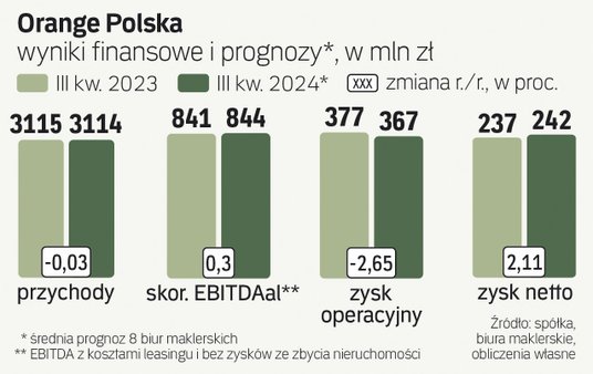 W trzecim kwartale br. Orange Polska uzyskał wyniki zbliżone do tych z analogicznego okresu w 2023 r. – wynika z prognoz biur maklerskich zebranych przez „Parkiet”. Średnia szacunków analityków mówi, że w minionym kwartale zakończonym 30 września grupa telekomunikacyjna kierowana przez Liudmilę Climoc miała 3,11 mld zł przychodów (o 0,03 proc. mniej niż rok wcześniej), 844 mln zł zysku operacyjnego powiększonego o amortyzację i pomniejszonego o koszty leasingu i zyski ze sprzedaży nieruchomości (wzrost o 0,3 proc. rok do roku), 367 mln zł zysku operacyjnego (spadek o 2,6 proc.) oraz 242 mln zł zysku netto (wzrost o nieco ponad 2 proc.).