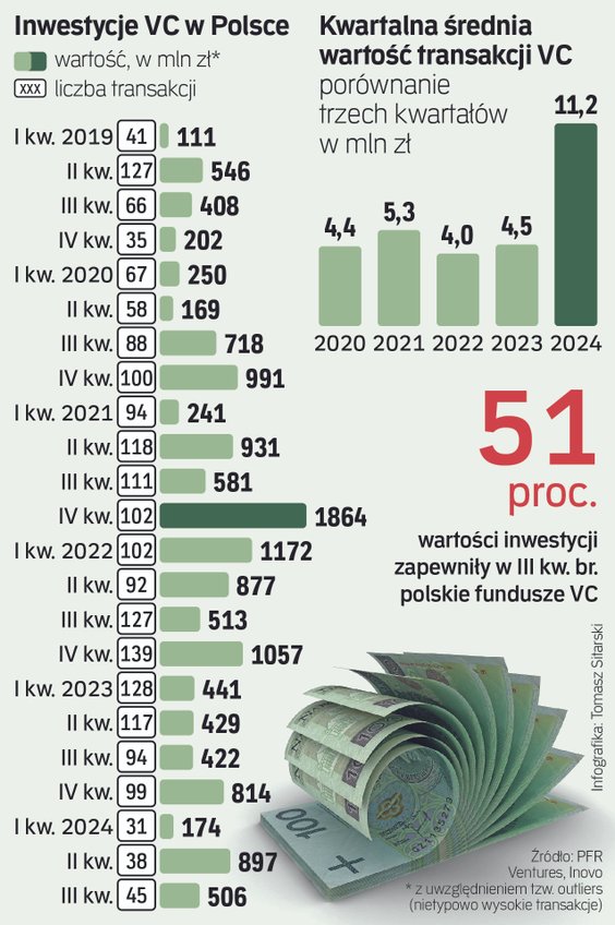 W sumie po trzech kwartałach 2024 r. strumień finansowania venture capital nad Wisłą sięgnął prawie 1,58 mld zł (rok wcześniej było to 1,29 mld zł). Widać, że rynek start-upów po trwającym wiele kwartałów kryzysie, związanym ze słabnącym strumieniem pieniędzy płynących od funduszy VC, wraca na ścieżkę wzrostu. Eksperci jednak studzą emocje. Widać choćby spadek liczby transakcji – po trzech kwartałach ub.r. było ich 339, a dziś jest trzy razy mniej (114). Aleksander Mokrzycki, wiceprezes PFR Ventures, wskazuje, iż właśnie wartość i liczba transakcji to dwa główne parametry wykorzystywane do oceny kondycji rynku venture capital. – Choć suma zainwestowanego w III kwartale kapitału utrzymuje się na poziomie analogicznym w relacji do roku poprzedniego, to liczba rund pozostaje istotnie niższa. Szczególny spadek obserwujemy w rundach zalążkowych, które jednocześnie postrzegamy jako kluczowe dla kształtowania się ekosystemu – komentuje.