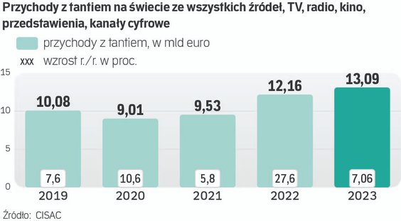 Dane raportu opisują zasadniczo pokoleniową zmianę i przejście widzów do internetu. Choć światowe tantiemy ze wszystkich źródeł osiągnęły nowy rekordowy poziom 13,1 mld euro, o 7,6 proc. więcej niż rok wcześniej, to największą siłą napędową są już od kilku lat tantiemy z kanałów cyfrowych, które urosły o 9,6 proc., do 4,6 mld euro w 2023 r., stanowią już więc 35 proc. całości dochodów. O 22 proc., do 3,28 mld euro, wzrosły tantiemy z wydarzeń publicznych, natomiast nadawcy telewizyjni i radiowi wypłacili – 3,9 mld euro, o 4 proc. mniej niż rok wcześniej. I te właśnie spadki ilustrują zmianę pokoleniową. Jeszcze przed dekadą, w 2013 r., telewizja i radio stanowiły 46 proc. całkowitych wpływów CISAC. W 2023 r. wpływy te spadły do zaledwie 30 proc.