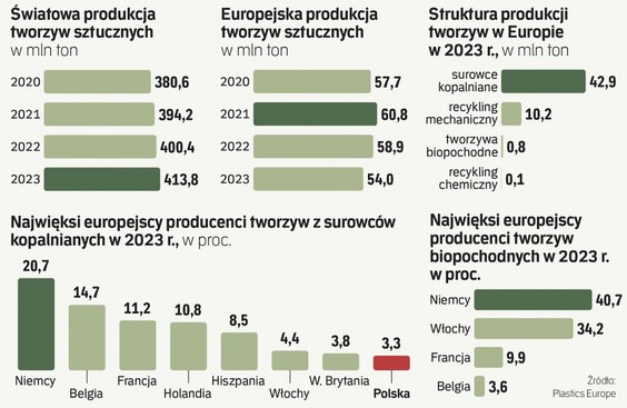W ubiegłym roku globalna produkcja tworzyw sztucznych wzrosła o 3,3 proc. (do 413,8 mln ton), a europejska spadła o 8,3 proc. (do 54 mln ton) – wynika z najnowszych danych Plastics Europe, stowarzyszenia producentów tworzyw ze Starego Kontynentu. Tym samym udział UE (liczony razem z Norwegią, Szwajcarią i Wielką Brytanią) spadł na świecie do 12,3 proc. Dla porównania w 2022 r. było to jeszcze 14 proc., a w 2006 r. nawet 22 proc. Nasz region w największym stopniu przegrywa globalną konkurencję z Ameryką Północną (ma 33,3-proc. udział w rynku), Chinami (17,1 proc.) i pozostałym krajami Azji (19,7 proc.).