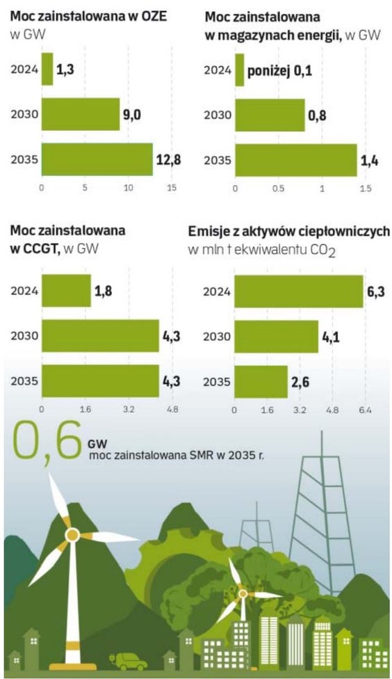 Orlen planuje zakończyć produkcję energii z węgla do 2030 roku, z kolei rezygnacja z węgla w ciepłownictwie nastąpi do 2035 roku. W kolejnych latach spadać będzie emisyjność w obszarze energetyki. Do końca tej dekady zmniejszy się o 40 proc., z 377 kg ekwiwalentu CO2 na MWh do około 220 kg, a do 2035 roku o 55 proc., do około 170 kg. Będzie to możliwe m.in. dzięki inwestycjom w energetykę odnawialną, które obejmują budowę farm wiatrowych na lądzie i morzu oraz instalacji fotowoltaicznych.