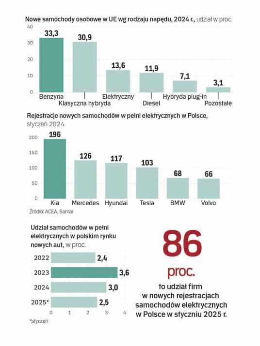 Mizernym pocieszeniem może być dla Polski fakt, że elektromobilność kuleje w całej Europie. Jak podało Europejskie Stowarzyszenie Producentów Pojazdów ACEA, w grudniu ub. roku sprzedaż elektryków w UE zmalała o jedną dziesiątą r./r., przy tym na największych europejskich rynkach – w Niemczech i we Francji – nastąpiły wyjątkowo głębokie spadki, sięgające odpowiednio 38,6 oraz 20,7 proc. W rezultacie udział pełnych elektryków w unijnym rynku samochodów osobowych stopniał na koniec 2024 r. do 13,6 proc. z 14,6 proc. rok wcześniej.