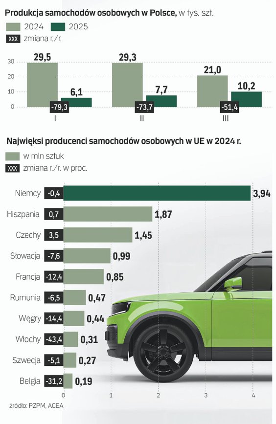 Głębokie spadki w fabrykach przyniósł już ubiegły rok. Według danych Polskiego Związku Przemysłu Motoryzacyjnego (PZPM), w grudniu 2024 r. wyprodukowano w Polsce 8,8 tys. samochodów osobowych, o ponad połowę mniej niż w podobnym czasie poprzedniego roku. Natomiast za cały ubiegły rok produkcja samochodów osobowych w Polsce wyniosła 216,2 tys. szt., podczas gdy rok wcześniej z taśm produkcyjnych zjechało prawie 300 tys. aut.