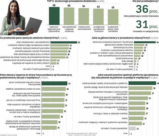 Niezależność, elastyczny czas pracy, satysfakcja i zarobek dzięki własnej kreatywności to główne powody, dla których ankietowani decydowali się na założenie działalności gospodarczej. Wyróżniają ich zdolności organizacyjne, planowanie, kreatywność, samodzielność i odpowiedzialność. Największym wrogiem biznesu jest nadprodukcja przepisów prawa i biurokracja, co potwierdzają badania przeprowadzone wśród prowadzących jednoosobową działalność gospodarczą (JDG) przez IBRiS na zlecenie „Rzeczpospolitej” w ramach projektu „Perspektywy Polskiej Przedsiębiorczości”.