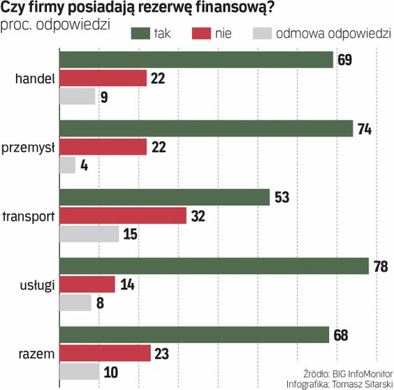 W ujęciu branżowym najwyższą rezerwę finansową, która w razie niespodziewanych sytuacji pozwoli nadal funkcjonować na rynku i utrzymać płynność finansową, posiada branża usługowa – 78 proc. pozytywnych odpowiedzi oraz sektor przemysłu – 74 proc. Najgorzej na tym tle wypadają przedstawiciele budownictwa oraz transportu – odpowiednio 48 proc. i 53 proc.