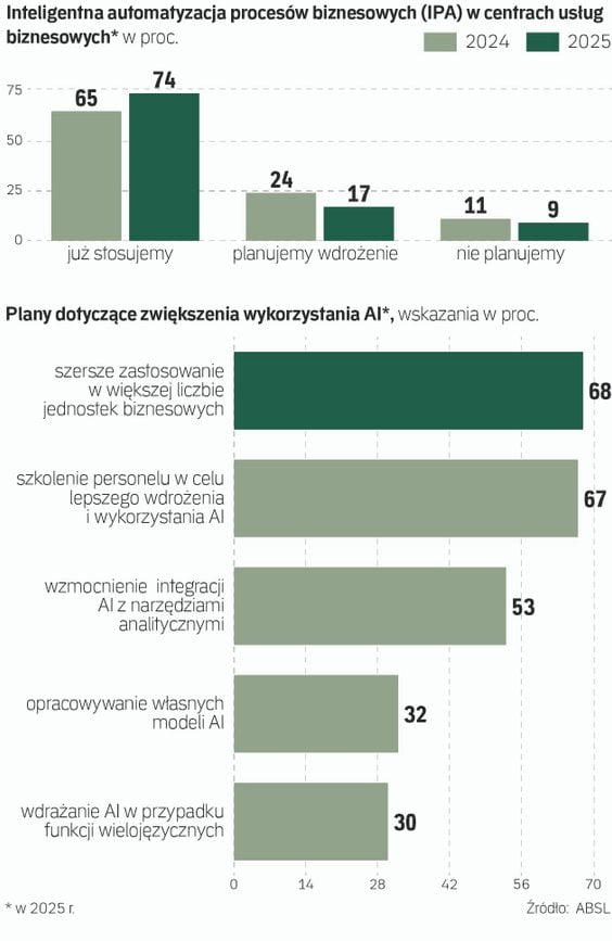 Wprawdzie w większości firm automatyzacja przy wsparciu AI nadal jest w początkowej fazie i ma niewielki wpływ na wzrost efektywności kosztowej i produktywności, lecz to się zmienia. Prawie siedem na dziesięć centrów usług, które wdrożyły AI, planowało w tym roku szerzej wykorzystywać te rozwiązania. I faktycznie to robią. Zdaniem Tomasza Brodzickiego, głównego ekonomisty ABSL, w sektorze widać wyraźny nacisk na rozwój sztucznej inteligencji; firmy coraz intensywniej wykorzystują narzędzia AI i wspomagają nimi coraz więcej kategorii procesów biznesowych.