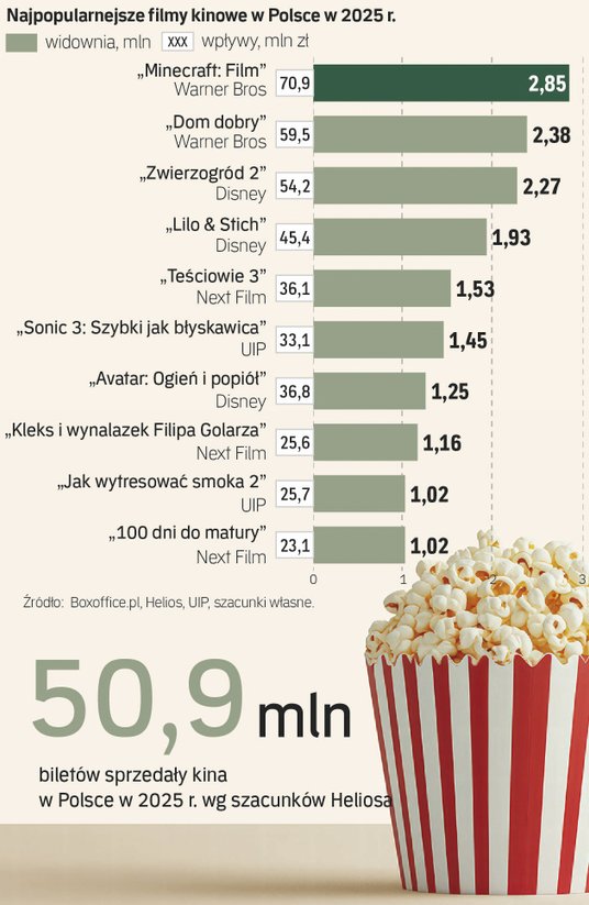 W 2025 r. kina w Polsce sprzedały 50,9 mln biletów za około 1,16 mld zł – wynika z danych, które opisujemy jako pierwsi. W 2026 r. ma być podobnie. O takiej frekwencji mówią szacunki sieci kin Helios (Grupa Agora) przygotowane m.in. na podstawie wewnętrznych danych firmy oraz danych dostarczanych przez kina do platformy Boxoffice.pl. Przypomnijmy: w 2024 r. wg szacunków Heliosa kina sprzedały około 50,8 mln wejściówek.