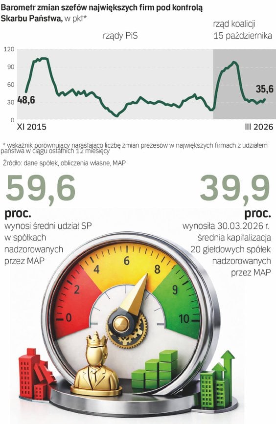 Początek 2026 r. nie był okresem spokoju w zarządach największych spółek z bezpośrednim lub pośrednim udziałem Skarbu Państwa. Nasz Barometr Prezesów, który narastająco mierzy zmiany dokonane w ostatnich 12 miesiącach na czele kluczowych firm pozostających pod kontrolą państwa, wzrósł w marcu do 35,6 pkt., czyli do najwyższego poziomu od wiosny 2025 r.