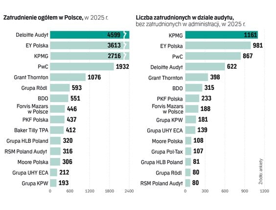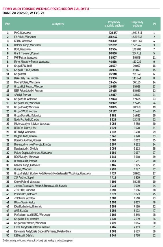 Na uwagę zasługuje wysoka, rzędu kilkunastu procent, dynamika wzrostu przychodów Grupy Rödl & Partner, BDO i Grant Thorntona. Ta pierwsza w 2025 r. zwiększyła przychody o niemal 14 proc. do ponad 231 mln zł, BDO urosło o prawie 14 proc., do niemal 150 mln zł, a Grant Thornton o 12 proc., do ponad 254 mln zł.
