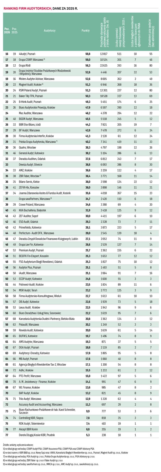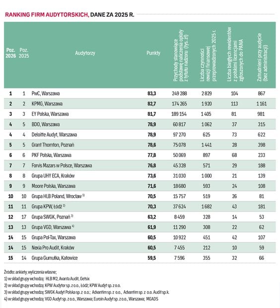 W pierwszej dziesiątce mamy te same firmy, jak rok temu. I na takich samych pozycjach. W tegorocznej edycji rankingu walka o miejsca była wyjątkowo zacięta – o poszczególnych lokatach decydowały ułamki punktów. Piątą pozycję utrzymał Grant Thornton, szóstą PKF, siódmą Forvis Mazaras, ósmą UHY ECA, dziewiątą Moore, a dziesiątą HLB.