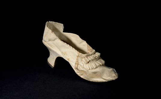 But ma 22,5 centymetrów długości (rozmiar europejski 36), szeroki obcas i wykonany został z koziej skóry oraz jedwabiu. Zdobią go cztery tasiemki, na pięcie ma wyhaftowane imię królowej i jest w zaskakująco dobrym stanie jak na ponad 200 letni, używany bucik.