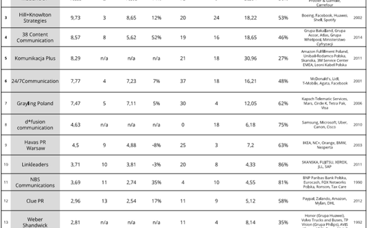 Za nią uplasowała się MSLGROUP ze znacznie niższymi przychodami netto w wysokości 32,84 mln zł, ale tej samej wartości procentowej „fee income" (56 proc.). Z usług agencji korzystają przede wszystkim Wyborowa Pernod Ricard, Żywiec Zdrój, Netflix, Procter & Gamble i Carrefour. Na podium stanęła również firma Hill+Knowlton Strategies, pracująca dla Boeinga, Facebooka, Huawei, Shella i Spotify. Poniżej przedstawiamy cały ranking agencji indywidualnych.