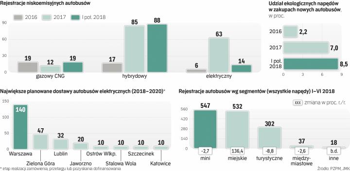 W sumie do wszystkich samorządów w Polsce, w ramach programu NCBR zaplanowano dostawę ok. 1 tys. ekologicznych autobusów. Część trafi np. do Krakowa. Tam już z końcem ub.r. jeździło 26 elektrobusów. W latach 2019–2021 przybędzie 161. Niezależnie od tego w br. miasto zakupi 158 kolejnych pojazdów z silnikami Euro 6 i hybrydowych. – Jesienią Kraków stanie się pierwszą dużą aglomeracją w Polsce, gdzie pasażerowie będą mieć do dyspozycji wyłącznie pojazdy ekologiczne – zapowiada Jacek Majchrowski, prezydent Krakowa.