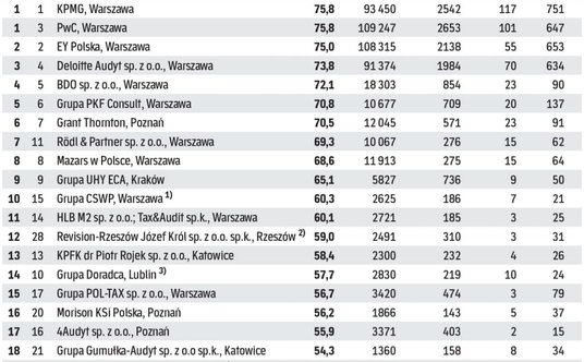 Bardzo dobrze w tegorocznym rankingu wypadło BDO, które systematycznie zmniejsza dystans do podium. Powody do zadowolenia mają też między innymi Grupa PKF Consult, Grant Thornton, Rödl & Partner, Mazars, UHY ECA oraz Grupa CSWP. Szczególnie wart uwagi jest awans firmy Rödl & Partner, która jeszcze rok temu była poza pierwszą dziesiątką, a teraz wskoczyła na siódme miejsce.