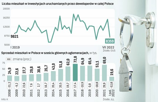 Pikujący popyt na kredyty hipoteczne oraz mieszkania przy utrzymującej się zaskakująco wysokiej produkcji – tak w minionym półroczu przedstawiał się rynek pierwotny. Dopiero dane za lipiec przynoszą bardzo wyraźne schłodzenie deweloperskich inwestycji. Według GUS w ubiegłym miesiącu ruszyła budowa niemal 8,4 tys. mieszkań – to wynik najgorszy od maja 2020 r., kiedy firmy ściągnęły lejce po wybuchu pandemii.