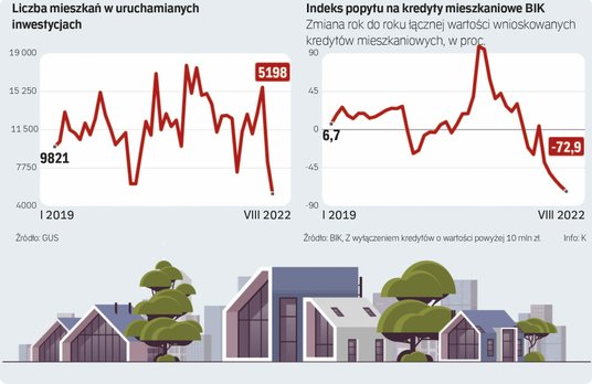 W ślad za postępującym kurczeniem się popytu na kredyty hipoteczne i spadkiem sprzedaży mieszkań deweloperzy przystąpili do mocnego cięcia inwestycji. Według danych GUS w sierpniu firmy ruszyły z budową zaledwie 5,2 tys. lokali, o 63 proc. mniej rok do roku (pamiętając, że sezon budowlany w 2021 r. był okresem bezprecedensowego boomu) i 38 proc. mniej niż w lipcu. Skalę skurczenia się inwestycji lepiej obrazuje fakt, że nawet w kwietniu i maju 2020 r., czyli w czasie lockdownu i niepewności, co do rozwoju pandemii, ruszała budowa 6,2 tys. mieszkań. To drugi raz, kiedy firmy zaczęły budować mniej mieszkań w skali miesiąca niż inwestorzy indywidualni domów!