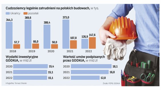 Drastyczny jest zwłaszcza odpływ z powodu wojny Ukraińców, stanowiących na budowach zdecydowaną większość obcokrajowców: z prawie 373 tys. w roku 2021 do niespełna 127 tys. w ubiegłym. Co prawda dziś firmy budowlane bardziej martwią się brakiem zleceń niż pracowników, bo inwestycje wyhamowały, co w pewnym stopniu niweluje braki kadrowe. Ale to ma się wkrótce skończyć.