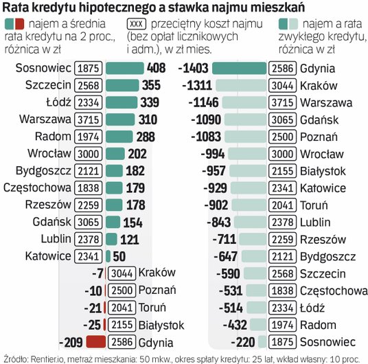 – Porównując stawki najmu z ratą zwykłego kredytu, w żadnym mieście kredyt nie jest korzystniejszy – zauważa Bubiel. Największą różnicę odnotowuje w Gdyni: rata jest wyższa o 1403 zł. W Krakowie – o 1311 zł, w Poznaniu – o 1083 zł, w Warszawie – o 1146 zł. Prezes Rentier.io przypomina, że osoby, które wezmą kredyt na 2 proc., przez pierwsze dziesięć lat dostaną dopłaty, które obniżą ratę tak, że oprocentowanie będzie wynosić 2 proc. plus marża.