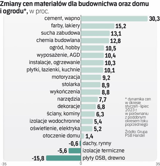 Do zgłaszania zwiększonego zapotrzebowania na razie nie zachęcają ceny. Z opublikowanych danych Grupy PSB Handel wynika, że w okresie od stycznia do lipca tego roku, poza płytami OSB i drewnem, izolacjami termicznymi oraz dachami i rynnami, w żadnej grupie asortymentowej nie odnotowano spadków cen. Co więcej, ze szczególnie dużymi wzrostami wydatków musieli się liczyć nabywcy cementu i wapna, bo na poziomie 30,3 proc. Ponadto o kilkanaście procent zdrożały farby i lakiery, sucha zabudowa i chemia budowlana.