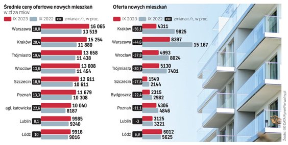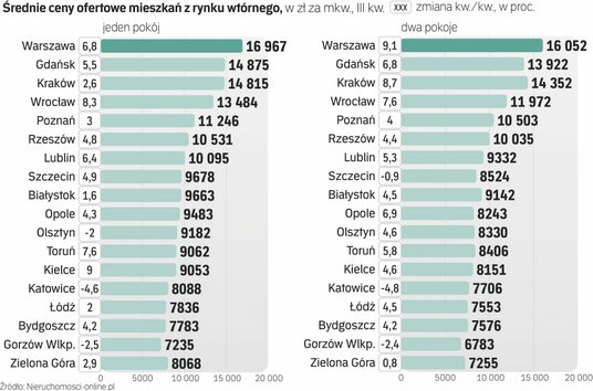 Ceny mieszkań biją rekordy. RynekPierwotny.pl podaje, że średnia cena ofertowa mkw. nowych lokali w Warszawie we wrześniu przekroczyła 16 tys. zł za mkw. – to o 18,8 proc. więcej niż rok temu. W Krakowie przeciętne ceny lokali deweloperskich wzrosły w ciągu roku o 28,4 proc., średnio do ponad 15,2 tys. zł, w Trójmieście o 19,4 proc., do ponad 13,6 tys. zł, w Poznaniu o 13,3 proc., do niespełna 11,7 tys. zł, we Wrocławiu o 13,6 proc., średnio do 13 tys. zł za mkw.
