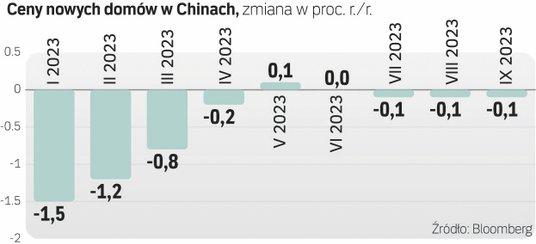 Brak tego zaufania jak na razie przekłada się na mniejszą sprzedaż u deweloperów. Według wyliczeń China Real Estate Information Corp. sprzedaż u 100 największych deweloperów w Państwie Środka spadła w październiku o 27,5 proc. rok do roku, po wrześniowym spadku o 29,2 proc. Fala bankructw wśród deweloperów sprawia, że Chińczycy mniej chętnie lokują swoje pieniądze w krajowych nieruchomościach. Wpływa to negatywnie na aktywność w tym sektorze. Inwestycje w nieruchomości spadły w pierwszych trzech kwartałach 2023 r. o 9,1 proc. Liczba rozpoczętych budów domów zmniejszyła się natomiast w pierwszych dziewięciu miesiącach roku o 23,4 proc. Liczba nowych projektów budowlanych spadła do najniższego poziomu od 2005 r.