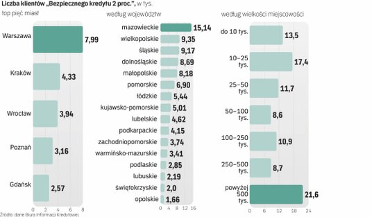 Z danych przygotowanych przez Biuro Informacji Kredytowej dla „Rzeczpospolitej” wynika, że pod względem liczby klientów najwięcej chętnych na „Bk2” było w wielkich miastach. W Warszawie po taki kredyt sięgnęło niemal 8 tys. osób, czyli ok. 8,6 proc. całości. W Krakowie 4,33 tys., we Wrocławiu 3,94 tys., a w Poznaniu 3,16 tys. Łącznie w największych metropoliach w Polsce (o liczbie mieszkańców powyżej 500 tys.) z „Bk2” skorzystało ok. 21,6 osób, czyli 23 proc. całości.