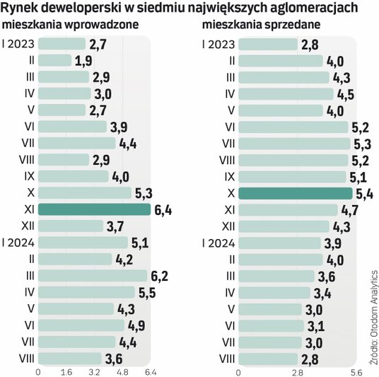 Katarzyna Kuniewicz, dyrektorka działu badań rynku w Otodom Analytics, mówi „Rzeczpospolitej”, że z jednej strony sierpniowa sprzedaż jest na poziomie ze stycznia 2023 r. i dla deweloperów nie jest to dobry wynik. Szczególnie że wtedy bufor wynosił 5 pkt proc. przy głównej stopie 6,75 proc., teraz bufor to 2,5 pkt proc., a stopa 5,57 proc. WIBOR 3M poszedł w dół z 6,95 proc. do 5,85 proc. Wtedy nie było programu wsparcia dopłat do kredytów, teraz też nie ma. Oferta sięgała 47 tys. mieszkań wobec 52,4 tys. obecnie. Z drugiej strony deweloperzy mogą powiedzieć, że w sierpniu nie było tak samo słabo jak w styczniu 2023 r., tylko jednocześnie znacznie znacznie lepiej. Uwzględniając bowiem zmiany cen, przy zbliżonym wyniku w ujęciu ilościowym w sierpniu br. deweloperzy sprzedali w siedmiu największych miastach mieszkania o szacunkowej wartości 2,2 mld zł wobec 1,7 mld zł w styczniu 2023 r. – to o 29 proc. więcej.