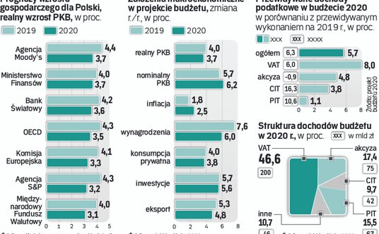Kryzys rzeczywiście nam raczej nie grozi, ale ryzyko, że PKB będzie rósł stosunkowo wolno, jest coraz większe. Ostatnio kilka instytucji międzynarodowych obniżyło prognozy na 2020 r. dla Polski: Komisja Europejska do 3,3 proc., agencja ratingowa S&P do 3,2 proc., a Międzynarodowy Funduszy Walutowy– do 3,1 proc. To znacznie mniejszy wzrost niż 5,1 proc. w 2018 r. i ponad 4 proc. w 2019 r.