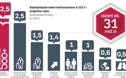 To kosztowne plany, które według szacunków „Rzeczpospolitej" w sumie mogą pochłonąć nawet 31 mld zł. Największa pozycja to oczywiście program 500+, który będzie kosztować 22,5 mld zł (w tym roku na dodatki na dzieci rząd po części zarobił, sprzedając częstotliwości LTE za 9,2 mld zł). Kosztowny jest też zapowiedziany powrót do niższego wieku emerytalnego (od października), co obciąży finanse państwa kwotą 2,5 mld zł.